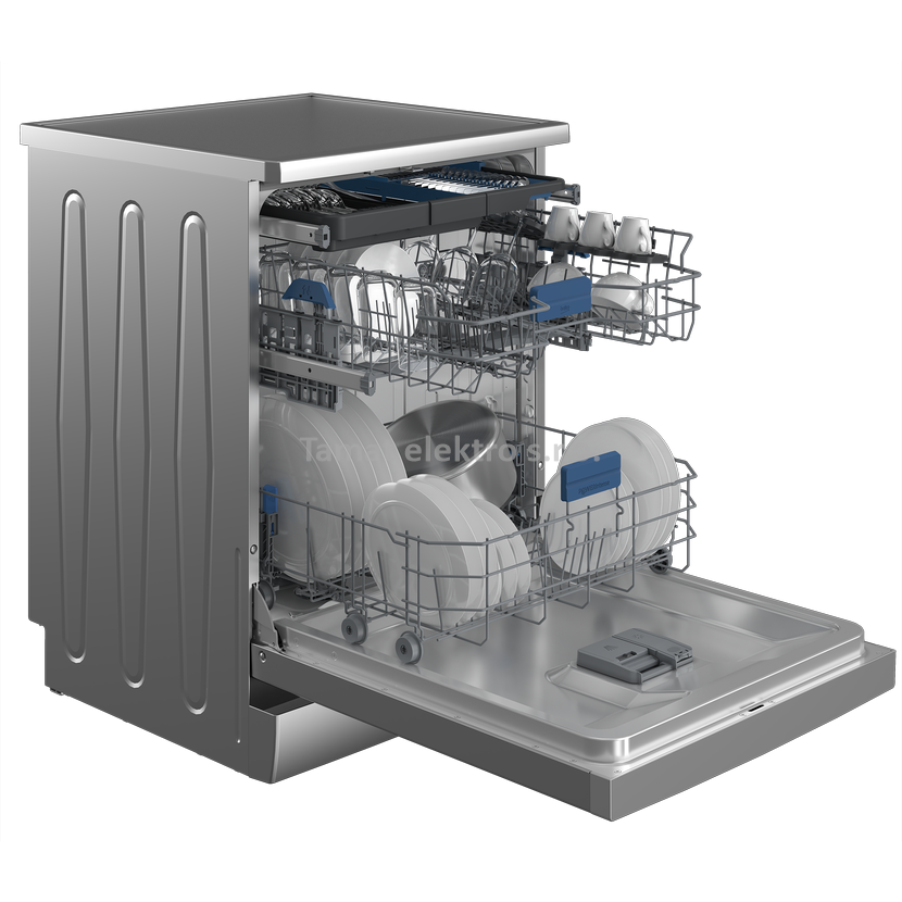 Volne stojící myčka v Energetické třídě C. Kapacita 15 sad nádobí, velmi tichý chod - hlučnost pouze 41 dB. Příborová zásuvka, 3 polohové nastavení prostředního koše, sklopné držáky na talíře. Technologie SensorAdapt - pomocí umělé inteligence myčka rozpoznají úroveň znečištění i množství nádobí a přizpůsobí mycí cyklus pro co nejlepší výsledky. Funkce SelfDry - automatické otevření dvířek po domytí. Mycí rameno ve spodní části myčky PowerIntense - čtyři rotační ramena pro vícesměrné ostřikování, které se dostane i do těžko přístupných míst. Ochrana proti vytopení WaterSafe+™ - bezpečnostní přívod vody.
