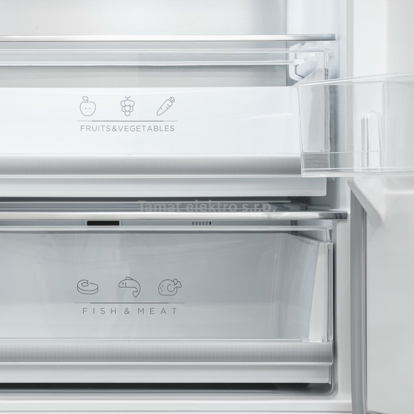 Prostorná a velmi praktická nízkoteplotní zóna umožňuje déle skladovat čerstvé maso, uzeniny, ryby apod., jelikož přídavný výparník umístěný za touto zónou zajišťuje vnitřní teplotu mezi 0 °C až +3 °C. Zásuvka Nízkoteplotní Fresh zóny se navíc pohodlně vysouvá díky teleskopickým pojezdům a lze ji dokonce snadno vyjmout už při otevření dveří v úhlu 90°. Zakřivené dno zásuvky umožňuje lepší cirkulaci vzduchu a tím rovnoměrné chlazení potravin.