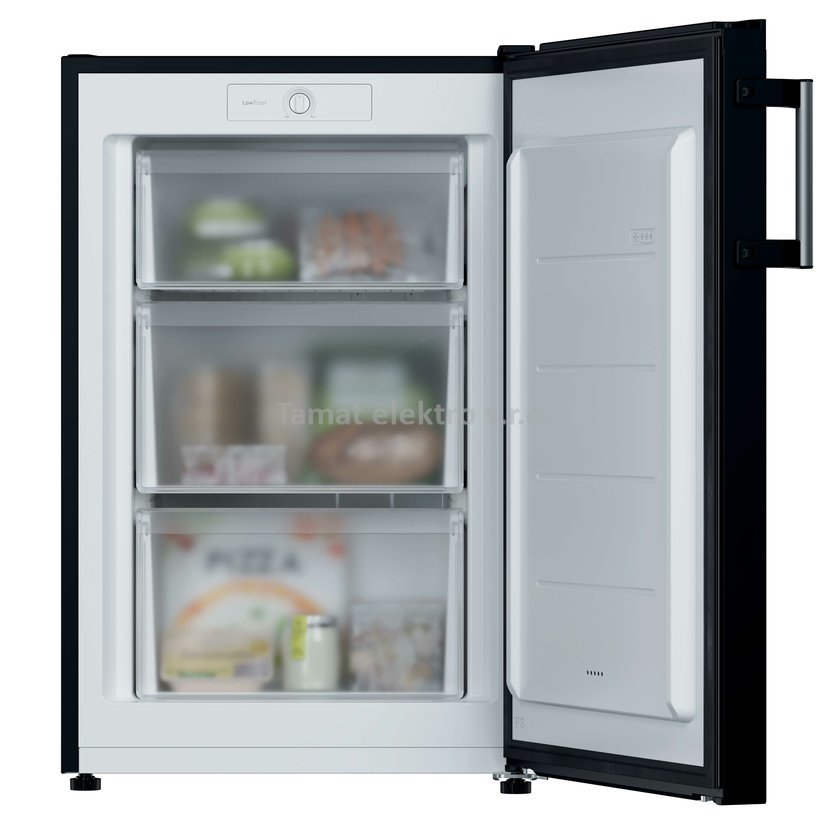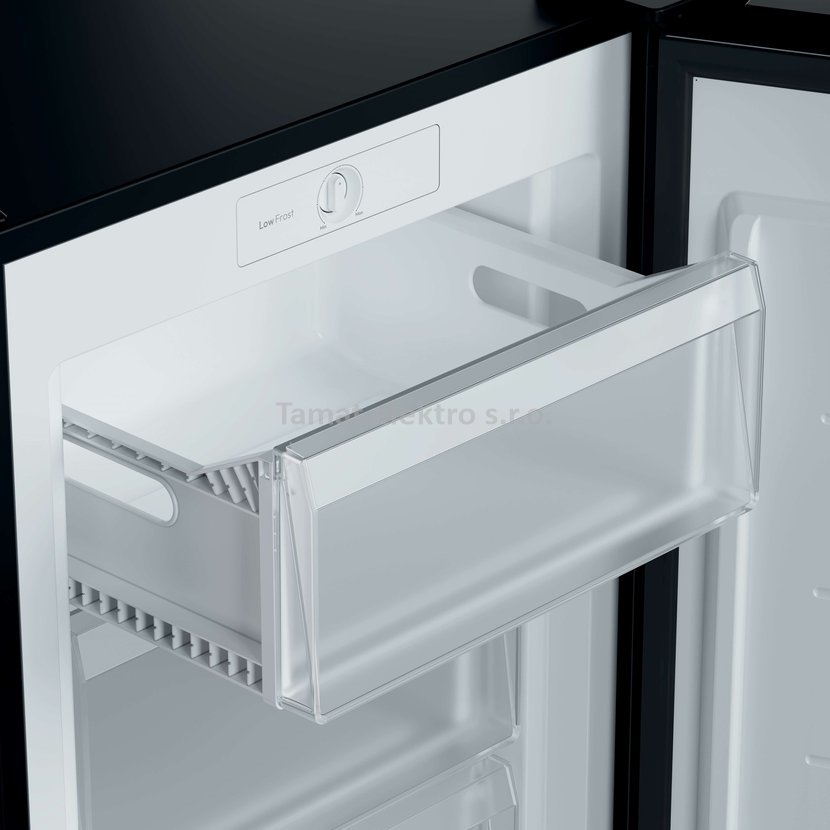 Volně stojící šuplíkový mrazák s vnitřním objemem 90 litrů. Velmi tichý chod - hlučnost pouze 37 dB. Energetická třída E, možnost záměny pantů a směru otvírání dveří, plynulá regulace teploty. Odolnost při výpadku proudu 12 hodin, mrazící výkon 4,1 Kg/24 hod. Technologie Low Frost - systém chlazení s menší tvorbou námrazy v mrazáku. Provedení nerez.