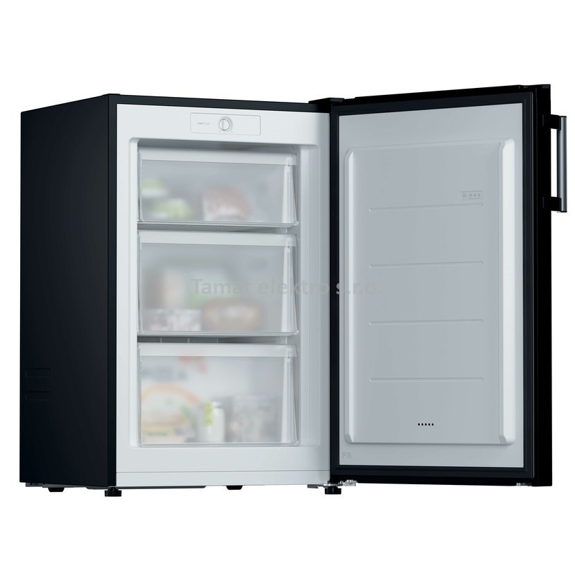 Volně stojící šuplíková mraznička v bílém provedení, celkový užitný objem 87 l. Elektronické řízení teploty s mechanickým ovládáním, možnost změny směru otevírání dveří, 3…