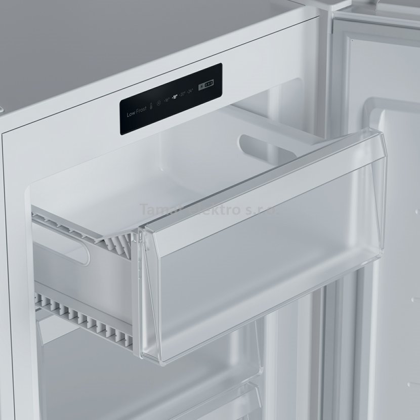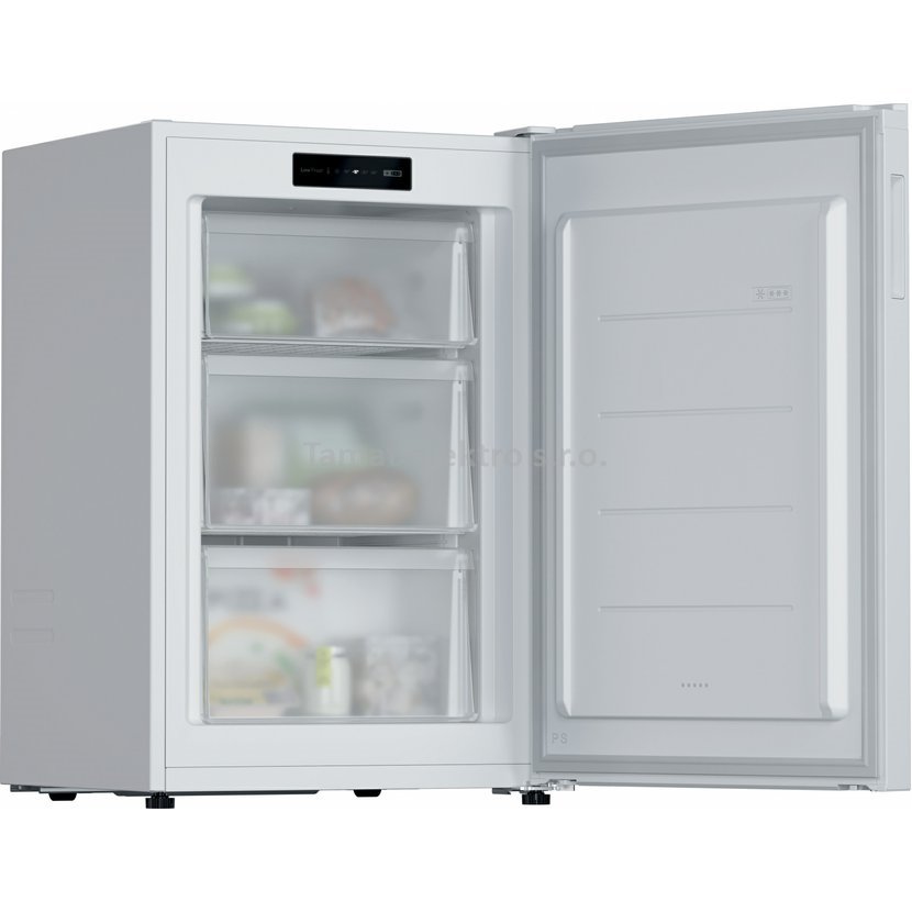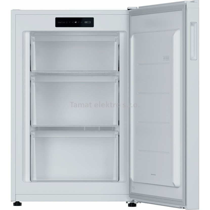 Volně stojící šuplíková mraznička v bílém provedení, celkový užitný objem 87 l. Elektronické řízení teploty s mechanickým ovládáním, možnost změny směru otevírání dveří, 3…
