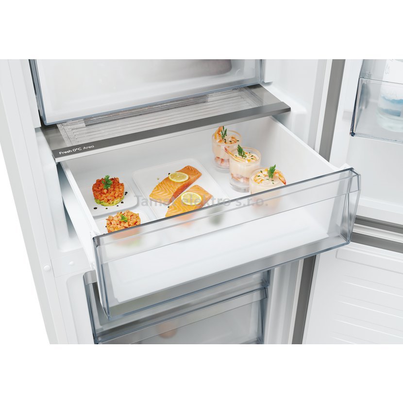 Volně stojící kombinovaná chladnička v Energetické třídě E. Velký vnitřní objem - 355 litrů (235/120). Funkce 0°C Fresh Area - možnost nastavení teploty zásuvky podle svých potřeb až do 0…