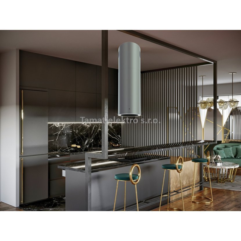 Odsavač zaujme svým elegantním válcovým tvarem, který se hodí do každého moderního interiéru. Bezdotykové ovládání gesty rukou eliminuje nutnost dotyku, což zabraňuje vzniku otisků prstů. Pro ty, kdo preferují tradiční ovládání, je k dispozici i dálkový ovladač, který zajišťuje maximální pohodlí.