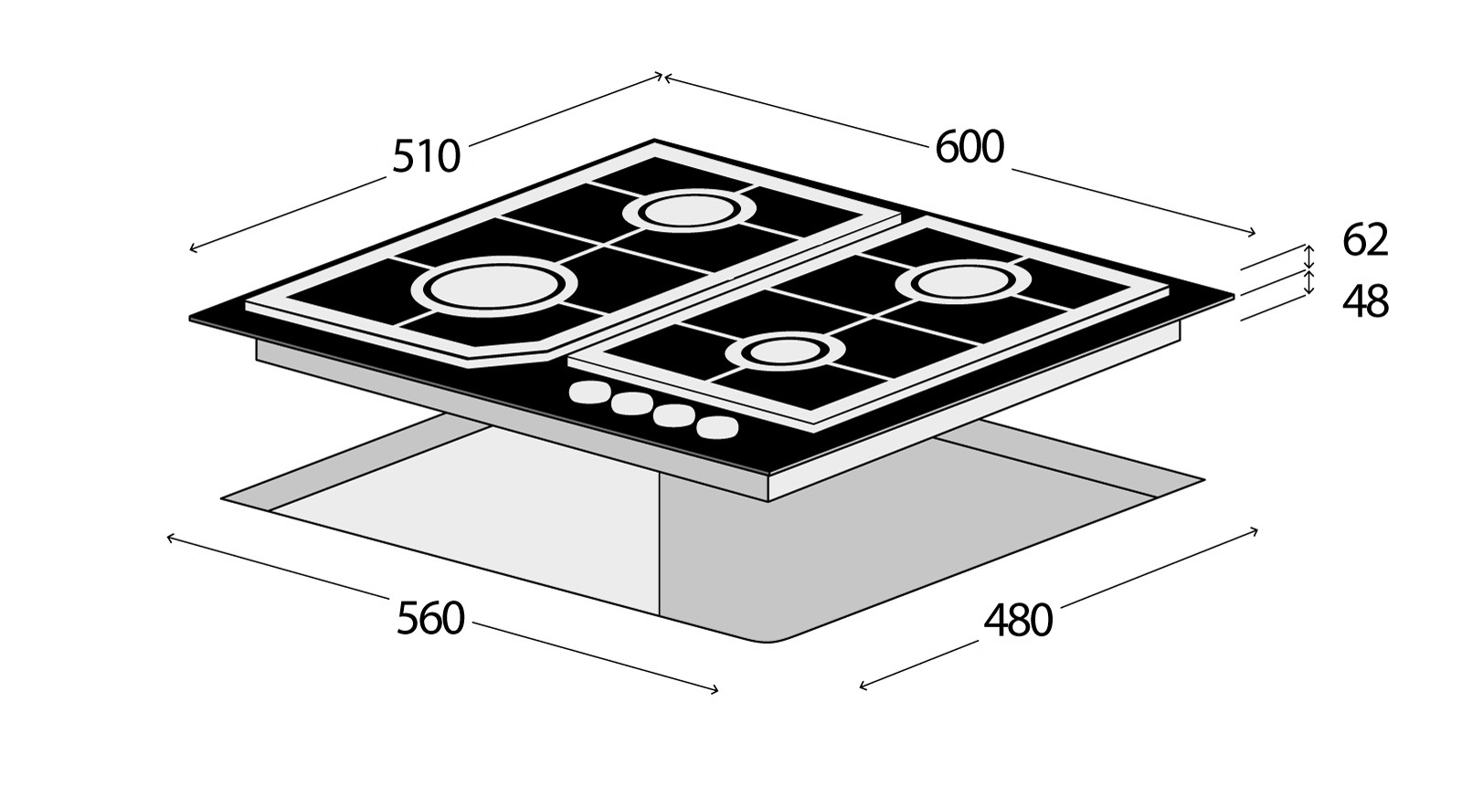 Plynová varná deska ze speciálního tvrzeného skla se 4 hořáky (z toho 1 Wok) a 2 masivními litinovými mřížkami. Ovládací panel je umístěn vpředu uprostřed. Zapalování hořáků je elektronické…