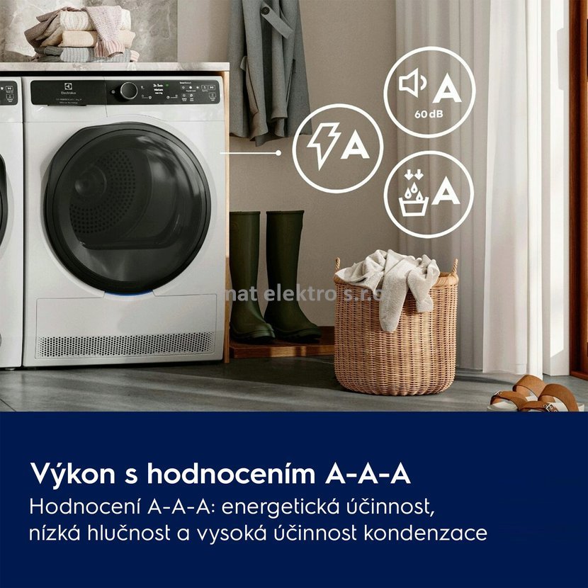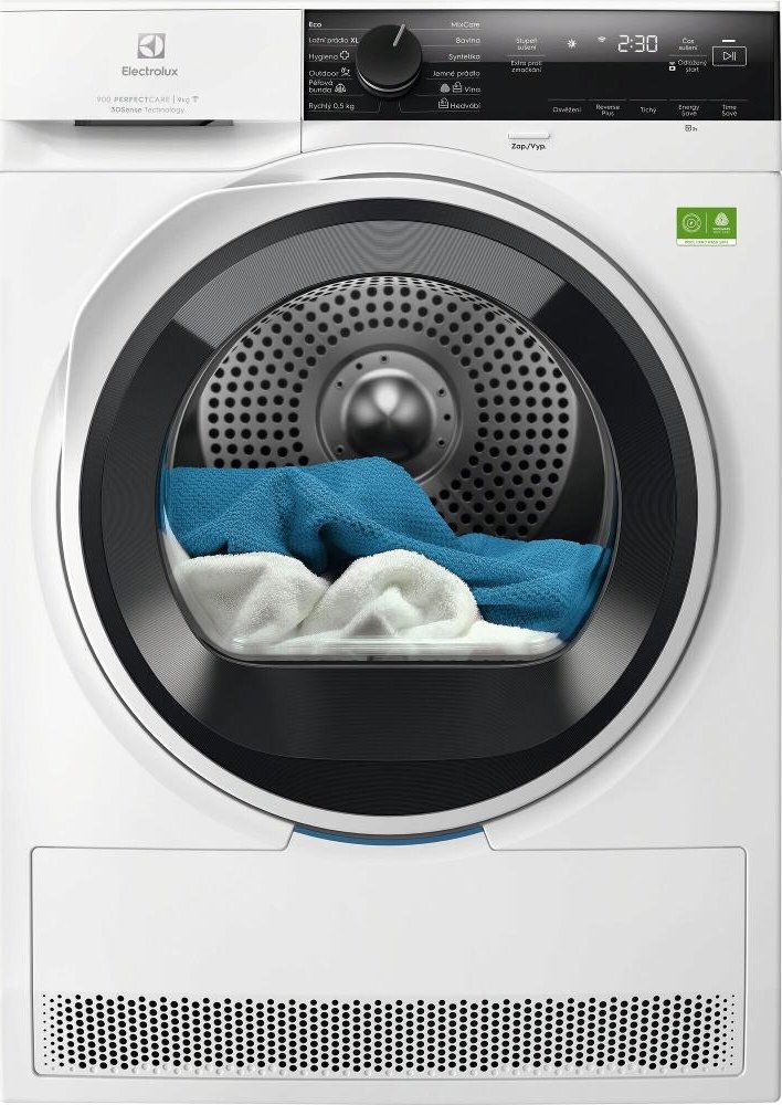 Sušička prádla s tepelným čerpadlem v Energetické třídě A. Kapacita sušení 9 Kg prádla, senzorem upravovaný čas sušení - na základě vyhodnocení vlhkosti může být prodloužen. Technologii 3DSense - hloubkové zjištění vlhkosti pomocí senzorů pro důkladné usušení každého druhu oblečení. WiFi - pračku lze ovládat mobilním telefonem pomocí aplikace Electrolux. Funkce SmartSave - tato dokonalá inovace v oblasti sušení umožňuje si u sušícího cyklu zvolit úsporu času nebo úsporu energie. Program MixCare+ - zajistí rovnoměrné usušení smíšeného prádlo bez nutnosti třídění. Přizpůsobí teplotu a pohyb bubnu tak, aby oblečení vydrželo déle jako nové. Vnitřní osvětlení pro optimální viditelnost v sušičce. Velký dotykový displej, Invertorový motor s prodlouženou zárukou na 10 let
