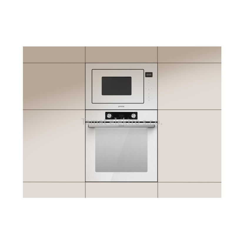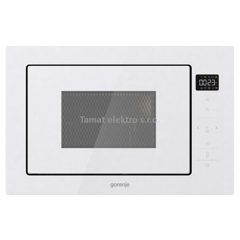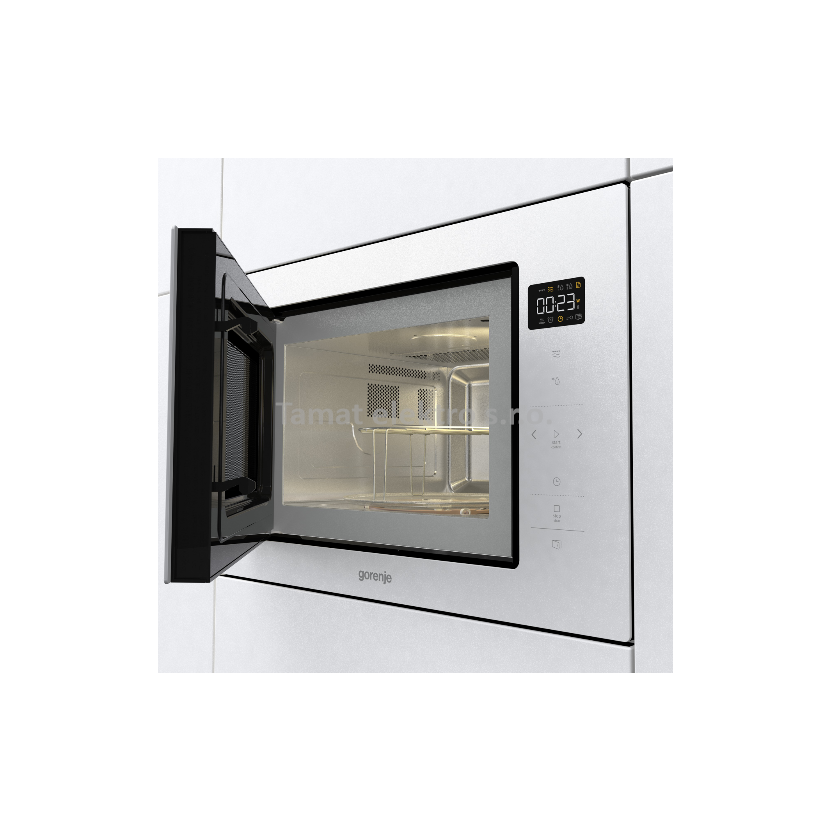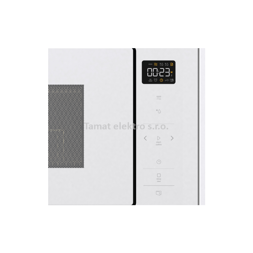 Vestavná mikrovlnná trouba v bílé barvě o objemu 34 litrů. Výklopné otevírání dvířek. Je vybavena 8 automatickými programy, grilem, funkcí pro rozmrazování, dětským zámkem a dotykovým ovládáním.