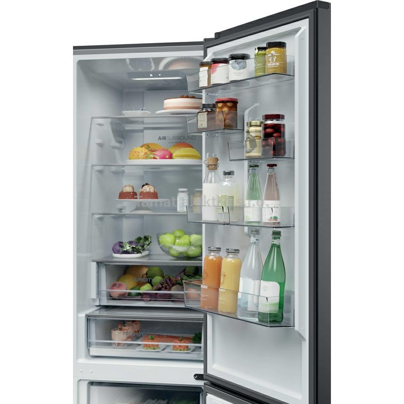 S beznámrazovou technologií Haier Air Surround Fresher Tech proudí vzduch uvnitř chladničky jemnějším a šetrnějším způsobem. Díky speciálním bočním vývodům na zadní stěně distribuuje tento systém studený vzduch homogenně v kruzích v celém prostoru chladničky. Tím brání přímému proudění na potraviny a ztrátě hmotnosti a vysušení. To je důvod, proč si potraviny skladované s Haier Air Surround zachovávají chuť, konzistenci a šťavnatost jídla až o 99 %* po 7 dnech jako první den.