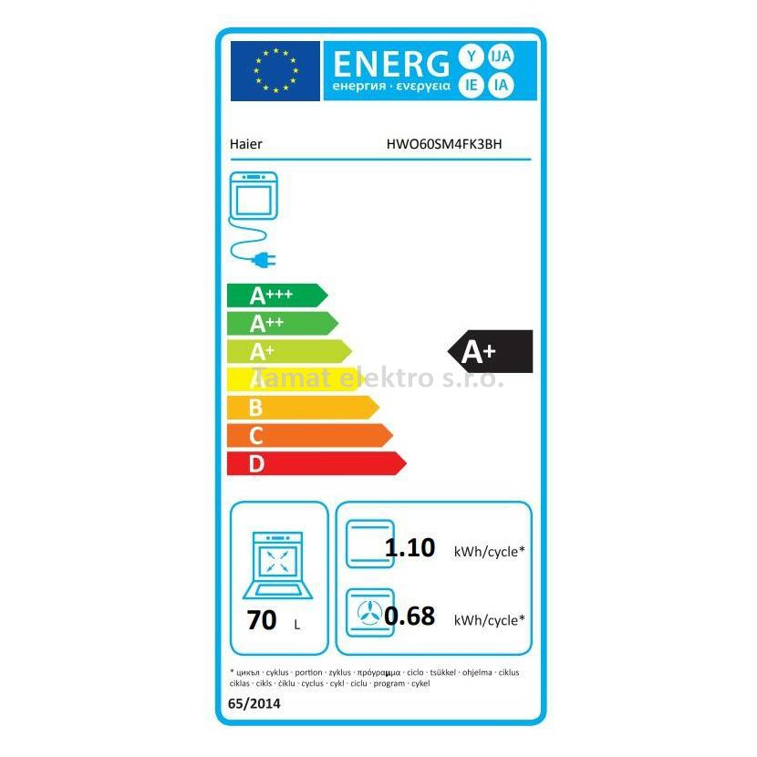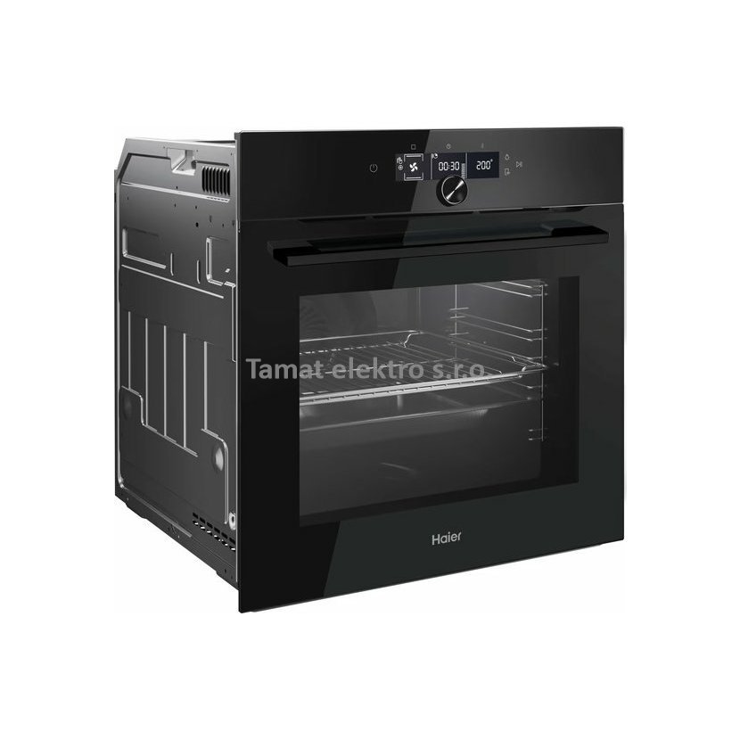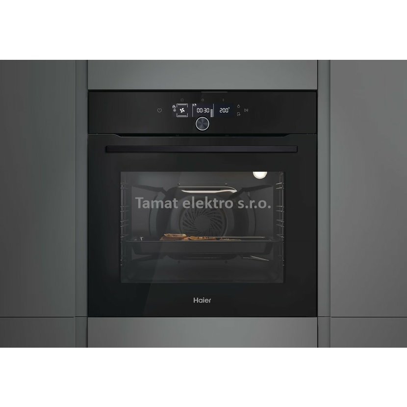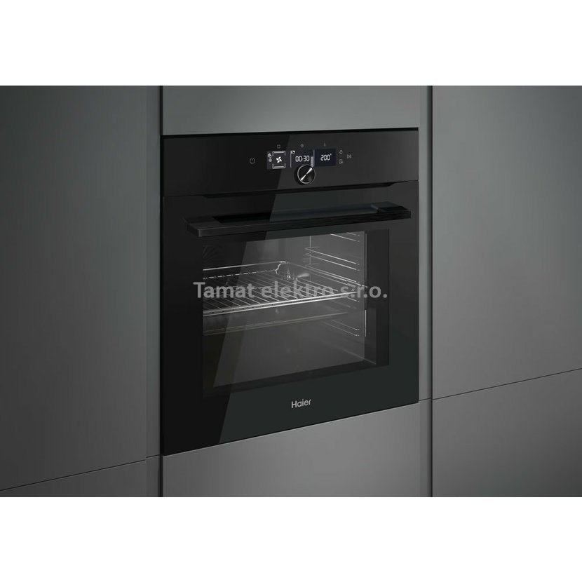 Vestavná horkovzdušná trouba z modelové řady Haier ID Series 2 v černém provedení. Energetická třída A+, objem trouby 70 litrů, teleskopické výsuvy. Funkce Soft Close - pomalé dovírání dvířek. Čistění H2O čištění – rychlé ekologické čištění pomocí vody, které je hotové za 90 min. 10 programů trouby + speciální funkce. Program Soft+ – kombinuje první fázi tradičního pečení a následně mění rychlost ventilátoru tak, aby koláče, sušenky a croissanty byly nadýchané a měkké. Funkce Air Fry Tray - horkovzdušné fritování. Program Tailor Bake – program pro přípravu uvnitř měkkých a na povrchu křupavých pokrmů. Pečení v páře Easy steam - asistovaná pára se spouští v konfigurací s různými topnými tělesy. Funkce Click&Clean – snadné čištění dvířek pouhým vycvaknutím lišty. Čistící systém Aquactiva - čištění trouby pomocí páry. Maximální teplota uvniř trouby 240 °C. Wi-Fi - možno ovládat přes mobilní telefon pomocí aplokace hOn
