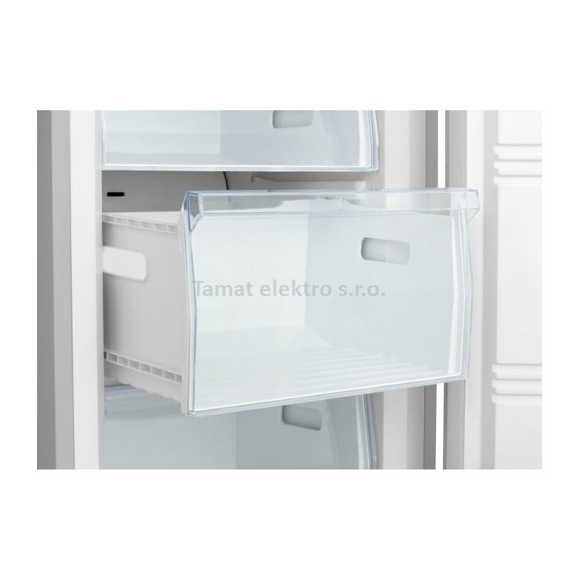 Volně stojící šuplíková mrazníčka s vnitřním objemem 240 litrů. Energetická třída C, beznámrazová technologie Total NoFrost. LED osvětlení, hlučnost pouze 36 dB. Funkce Super Freeze - rychlé mrazení.