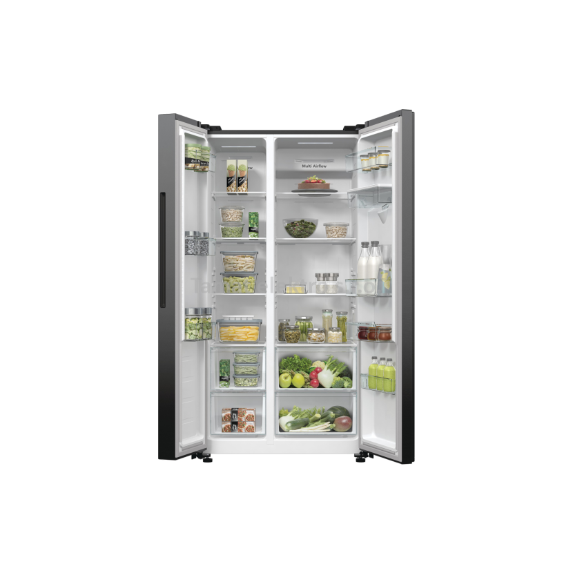 Americká chladnička v černé barvě v energetické třídě D. Celkový objem 547 litrů (355/192). Funkce Convert - umožní přepínat mezi režimem chladničky a mrazničky a snadno si přizpůsobit úložný prostor podle aktuálních potřeb. Samozavírací dveře - díky automatickému zavírání dveří už nikdy nezapomenete chladničku otevřenou. Při úhlu 15° se dveře samy zavřou, čímž udrží chlad a šetří energii. Total NoFrost - beznámrazový systém. Super Freeze - rychlé zmrazení pro zachování chuti a živin. Funkce Holiday - uchová potraviny během vaší dovolené.