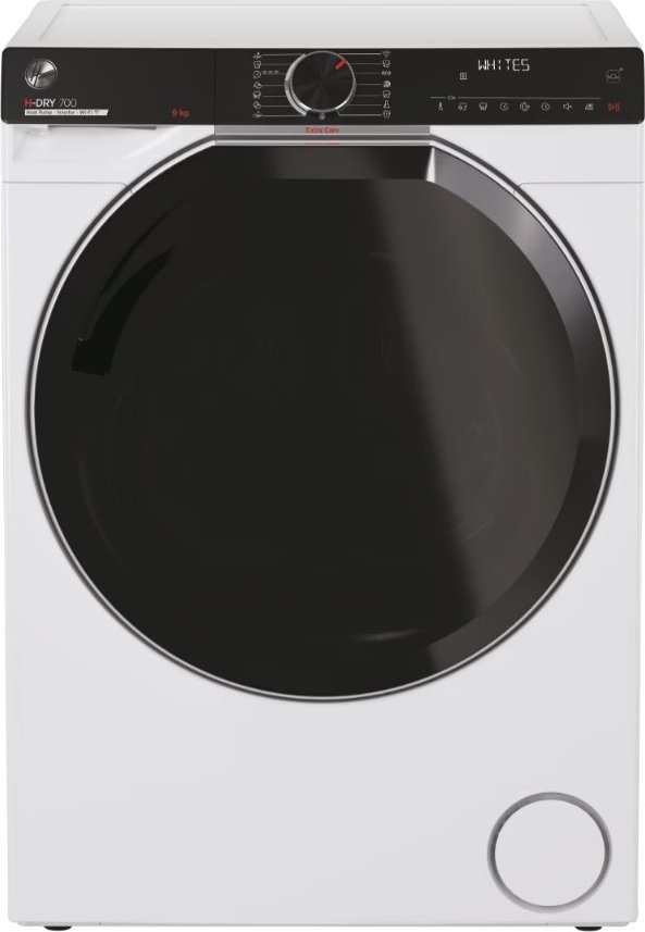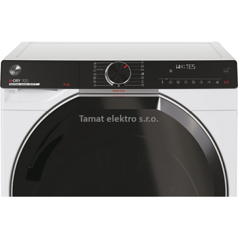 Volně stojící kondenzační sušička Hoover H-DRY 700 s tepelným čerpadlem v Energetické třídě A+++. Kapacita 9 Kg prádla, Wi-Fi - pokročilé dálkové ovládání přes mobilní zařízení. Dotykový 5-ti místný displej v češtině, Aplikace hOn navrhne nejlepší program pro péči o vaše oděvy, kompatibilní s hlasovými aplikacemi Alexa a Google. Auto Care – automatické přizpůsobení sušení různých materiálů. Easy Case - nádoba na vodu umístěna na dveřích sušičky. Certifikát Woolmark pro sušení vlny, elektronický senzor vlhkosti. Eco-Power Inverter - aktuálně nejvýkonnější a nejtrvanlivější typ motoru na trhu s prodlouženou zárukou na 20 let. Vnitřní osvětlení bubnu