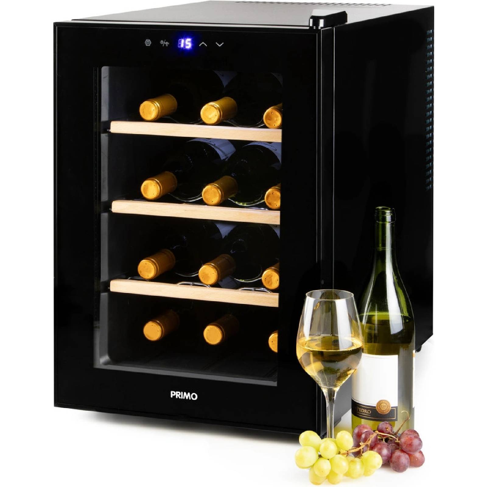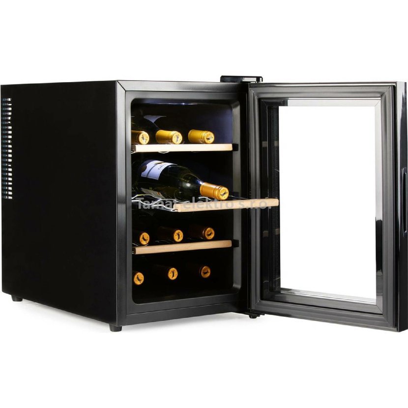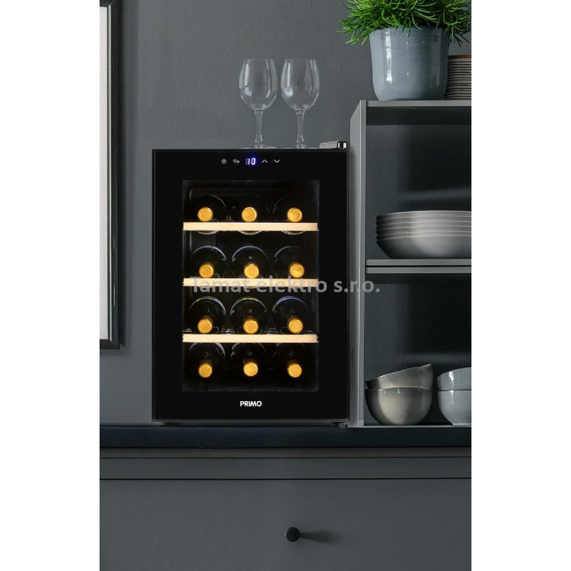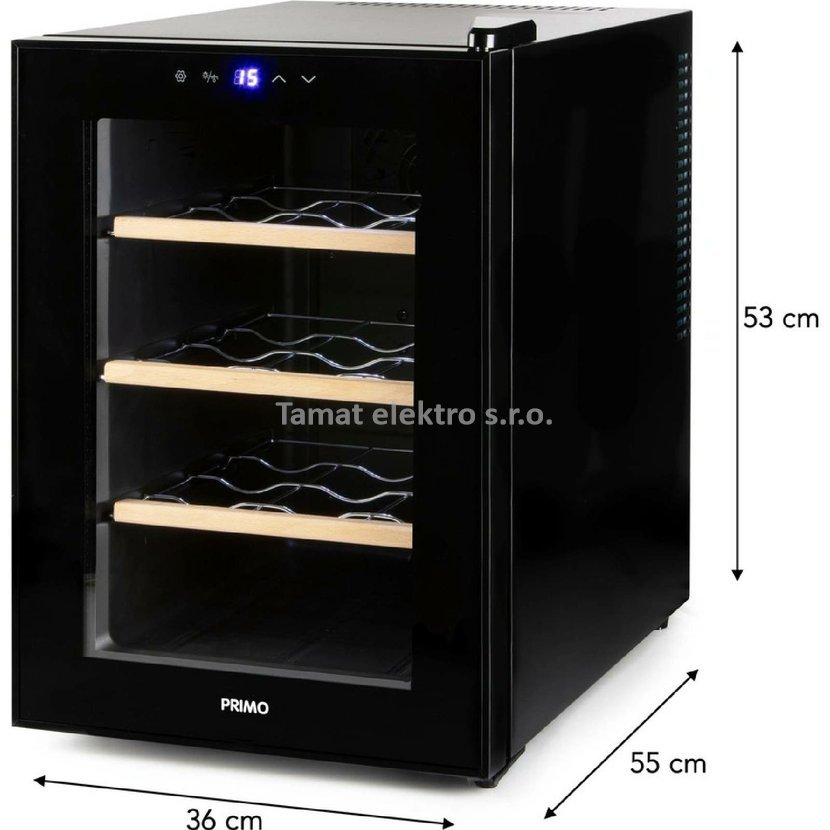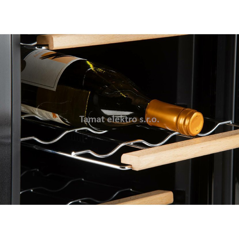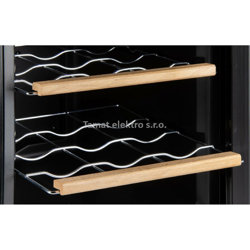 Domácí vinotéka na 12 lahví je uvnitř vybavena výsuvnými kovovými policemi, na které můžete pokaždé umístit 2 lahve nad sebe ve vodorovné poloze. Tím se zabrání vysychání korku a zajistí se, že vaše lahve vína vydrží dlouhodobě skladovat. Tři kovové police s vysoce kvalitní dřevěnou povrchovou úpravou navíc poskytují nejen praktické uspořádání, ale také vintage vzhled. Víno z vinotéky bude vždy vychlazené na správnou teplotu, kterou si lze jednoduše nastavit i sledovat na podsvíceném LED displeji. Svým elegantním designem s vnitřním LED bílým osvětlením doplní váš interiér. Velmi tichý provoz bez vibrací pouhých 25dB. Digitální nastavení teploty: 5 °C až 18 °C.