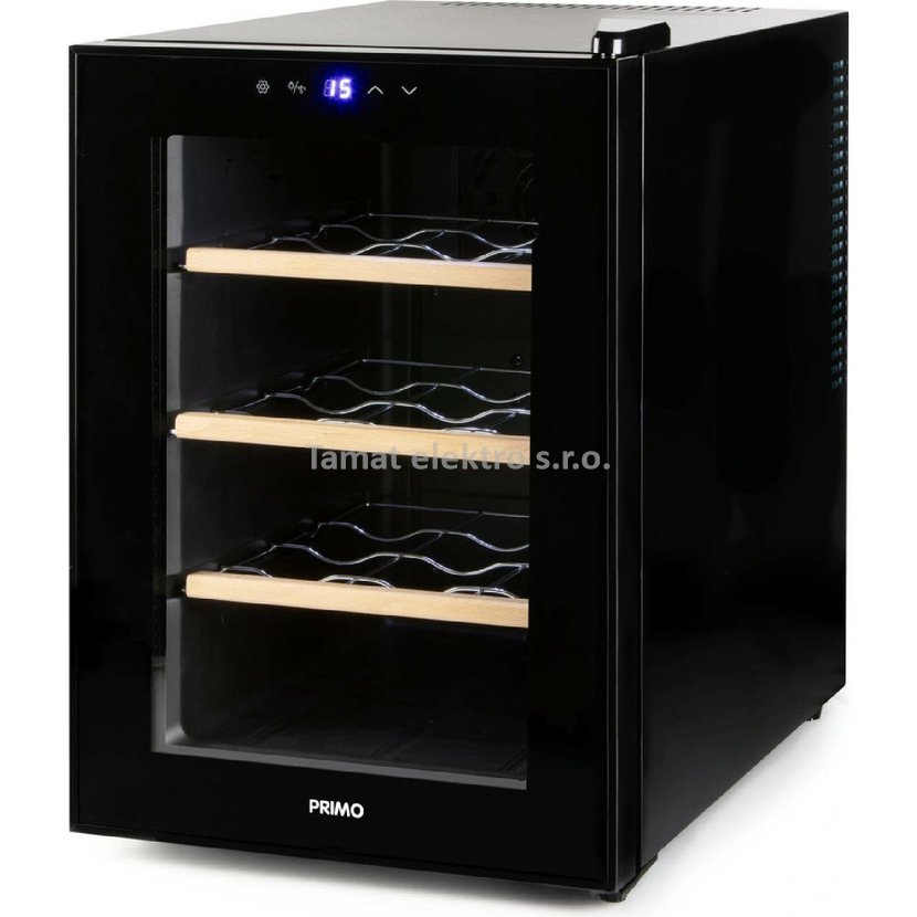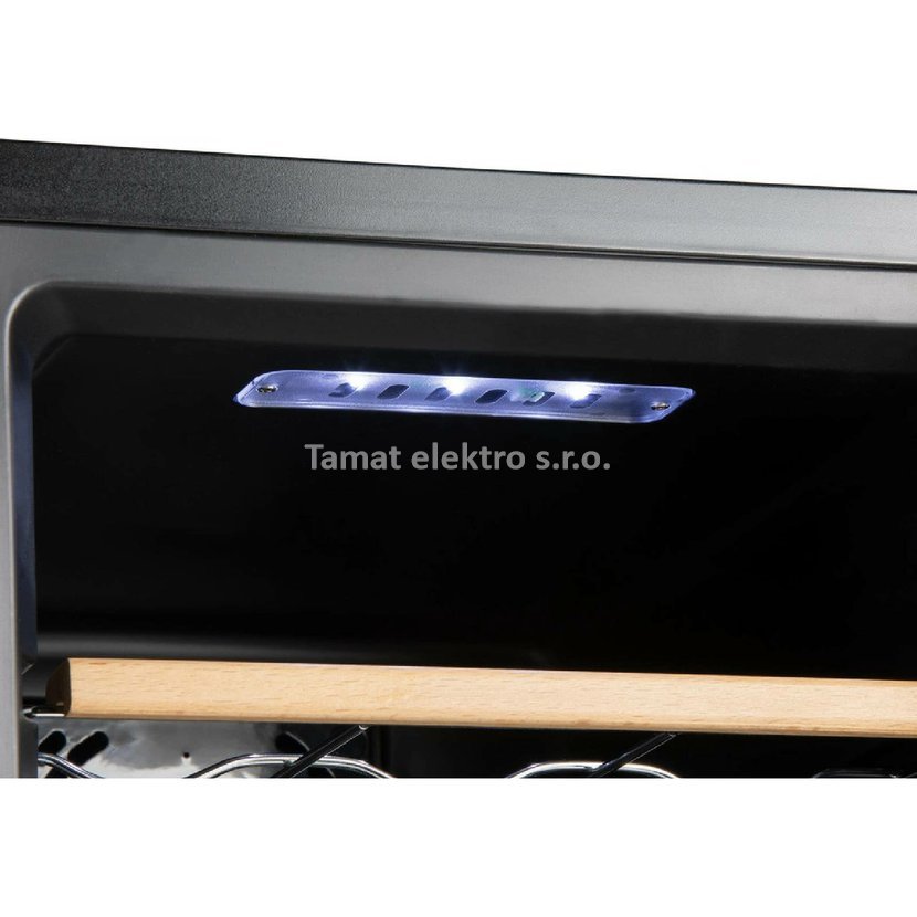 Hlavní parametry vinotéky Typ přístroje: domácí vinotéka (monoklimatická) Kapacita lahví: 12 ks Energetická třída: F Roční spotřeba energie: 77 kWh Velmi tichý provoz bez vibrací Hlučnost: 25 dB(A) 3 kovové police s vysoce kvalitní dřevěnou povrchovou úpravou Nastavení teploty: 5 °C až 18 °C Osvětlení vnitřního prostoru bílým LED světlem Digitální ovládání s LED displejem ukazujícím aktuální teplotu Tlačítko pro zapnutí/vypnutí vnitřního osvětlení Elegantní vzhled s prosklenými dvířky Vnitřní ventilátor pro zajištění cirkulace vzduchu